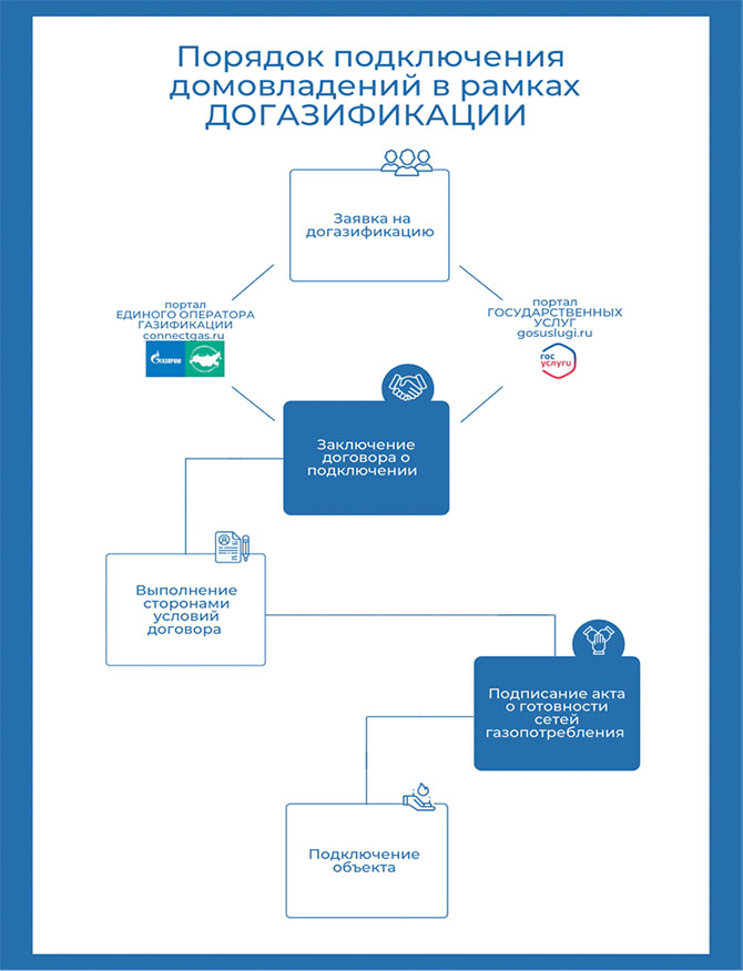 1. Сформировать заявку на догазификацию. Прием заявок на догазификацию без привлечения средств граждан осуществляется через порталы Единого оператора газификации (https://connectgas.ru/), Госуслуг (https://www.gosuslugi.ru/) или в территориальных ЭПУ ООО «Газпром трансгаз Казань»;